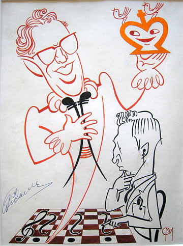 La caricatura de la izquierda es obra de Masec Oto y hace referencia a las habilidades como cantante del recientemente fallecido G.M. Smylov.