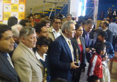Comparto algunas fotos que tomé y una breve nota de la exhibición de Karpov y Kasparov en el Coliseo Dibós, el martes 22 pasado, organizada por el Instituto Peruano del Deporte (IPD).Concurrió un buen número de personas y entre ese tumulto de gente pude ver muchas caras conocidas. Fue una gran oportunidad de reencuentro con personas que no veía años. Ahí, confundidos con un público nuevo, estábamos muchos de nosotros, antiguos compañeros y rivales ajedrecísticos universitarios, para recordarnos que nuestro cariño al ajedrez había sobrevivido al paso del tiempo. Algunos no nos veíamos años, pero rodeados de las mesas de ajedrez y los dos enormes pantallas de video a todo color que hacían un zoom de las caras de los campeones, era como si el tiempo no hubiera transcurrido.