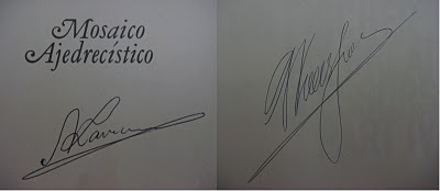 Tuve la suerte, gracias a Carla Córdova del IPD, quien gentilmente se tomó el trabajo de darle a Karpov y Kasparov un par de mis libros de ajedrez que más aprecio, de obtener las firmas de estos campeones. Karpov me firmó el “Mosaico Ajedrecístico”, aquella joya ajedrecística que escribió junto a E. Guik en 1984. Kasparov hizo lo propio con la versión americana del libro que escribió el 2004 sobre Bobby Fischer en la cuarta entrega de la serie “Mis grandes predecesores”. La idea de hacerle firmar este libro a Kasparov la tomé de James Alvis.